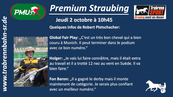 Ici le premier vainqueur de Derby: Fon Baron (Robert Pletschacher), récent lauréat du Derby tchèque à Prague, qui a offert à son driver le plus grand succès de sa carrière. Le niveau en Allemagne est un peu au-dessus, mais Fon Baron avait déjà montré de belles choses à Baden en finissant fort. Attention à Aconcagua (Rudi Haller), en pleine progression. Pour vos combinaisons étendues, pensez à Unfinished Business (Christoph Fischer), Lennarth (Vitus Schwaiger), Joceline BR (Gerhard Mayr), Jerry Box (Ferdinand Veit) et Speedy Ela Su (Marisa Bock).